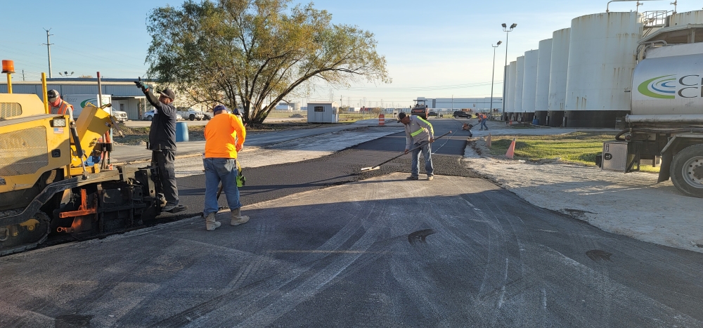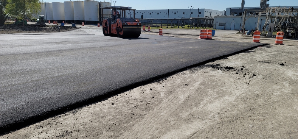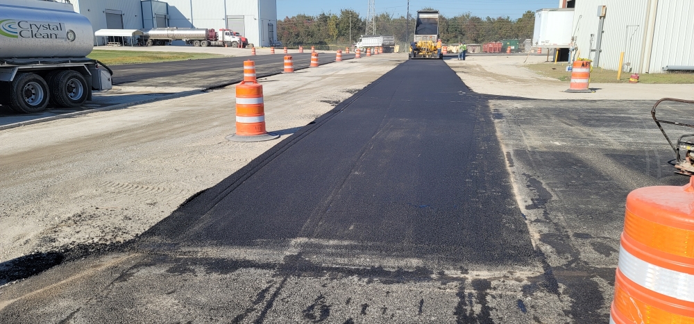 • American Paving then installed a 3-inch asphalt overlay using type-D hot mix. The asphalt was then compacted to the needed density using a vibratory roller.