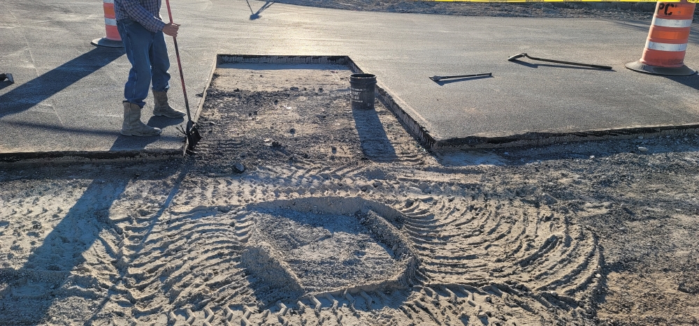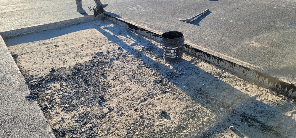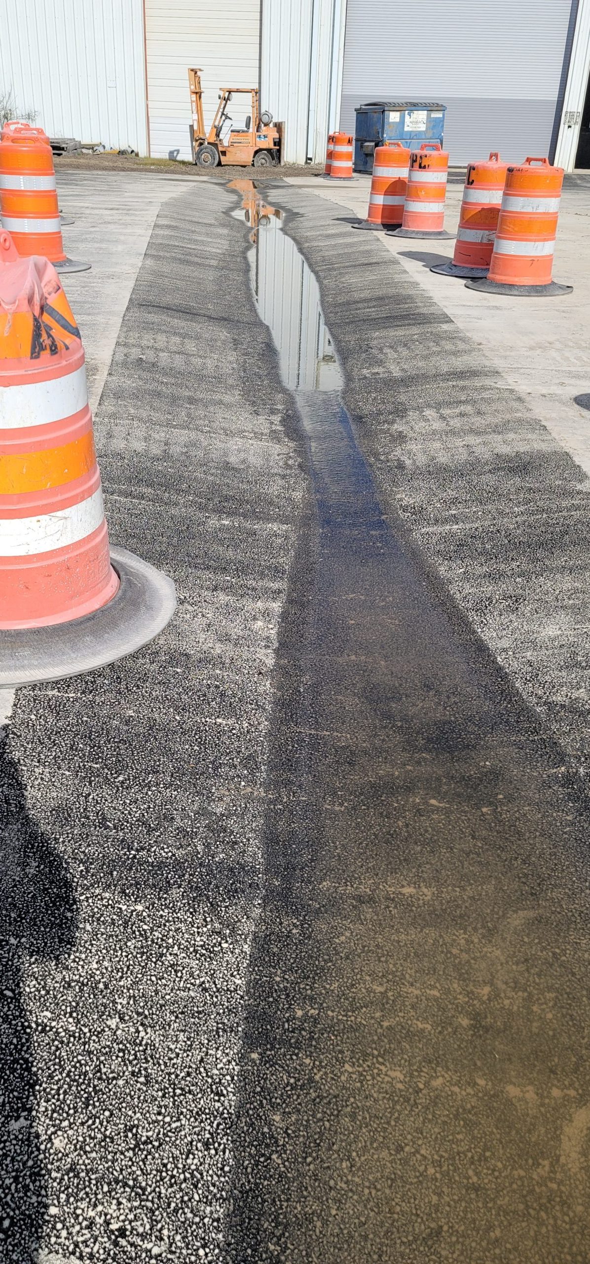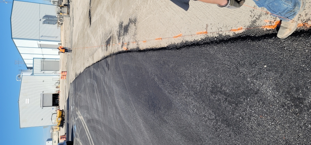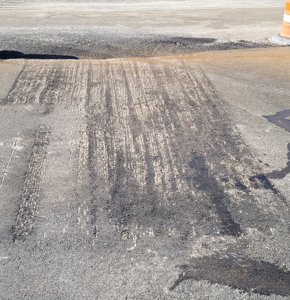 • Prior to overlaying, all vertical surfaces of the existing pavement were tack-coated. Tack coats act like an adhesive between tie-ins, promoting a tighter bond between the existing pavement and new asphalt.