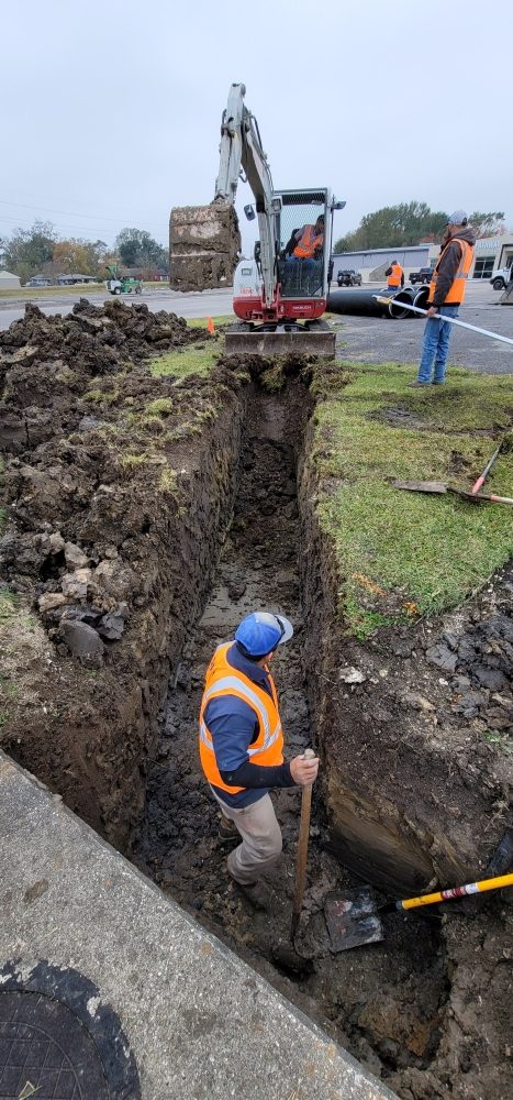 In addition, there was a storm sewer inlet to install. This involved importing and placing cement-stabilized sand, installing 120 linear feet of HDPE pipe, and installing three drain inlets (two 30” and one 36”). The area was then backfilled with rock onsite.